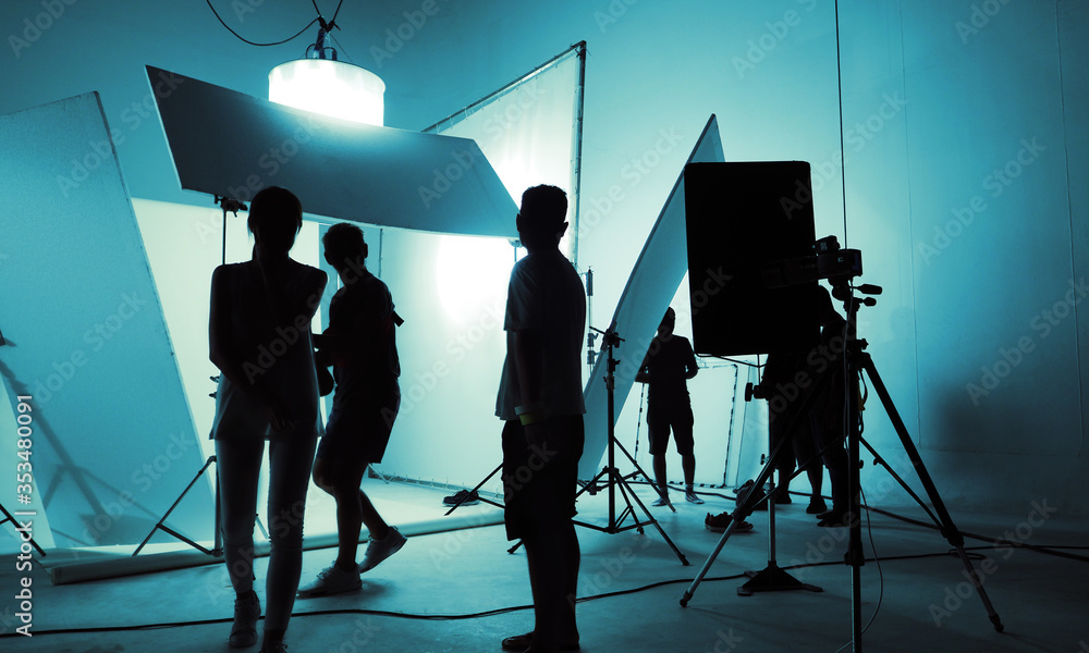 Shooting Studio For Photographer And Creative Art Director With Production Crew Team Setting Up Lighting Flash And Led Headlight On Tripod And Professional Equipment For Portrait Model Photo Shoot Stock Photo